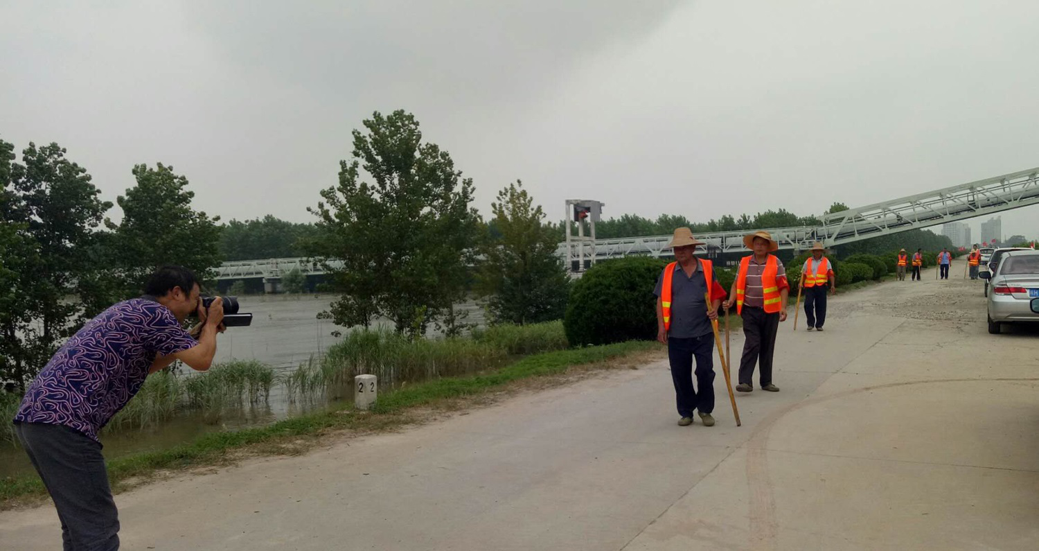 我們站在堤壩上等著大功臣吳玉傳巡查回來。陳圣文端起了相機……