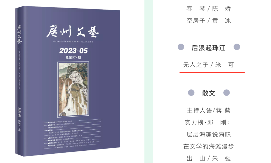 近日,米可創作的中篇小說《無人之子》發表于《廣州文藝》2023年第5期“后浪起珠江”欄目。